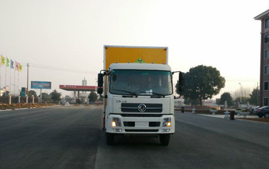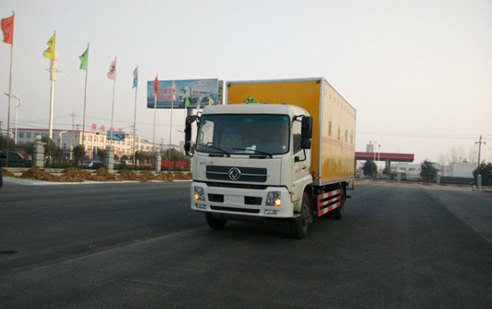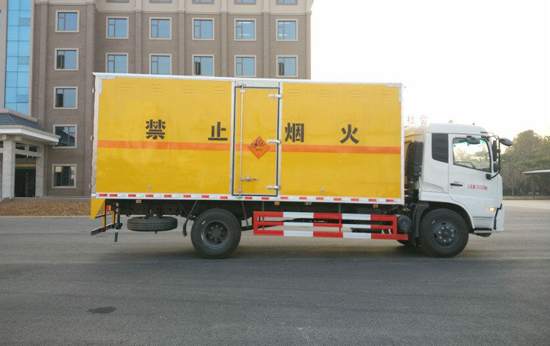 湖北程力專用汽車股份有限公司生產的爆破器材運輸車 廂體:為雙層金屬骨架結構,外部為冷扎鋼板,內壁采用鋁合金板蒙面,夾層為隔熱阻燃材料填充。設置對開門,如需安裝抗暴容器則增開側門,側壁設有防雨功能自然通風窗口,底部鋪有阻燃導靜電膠板,保證安全。廂體內部前面和側面裝有固定拉環,與捆綁帶使用捆綁貨物以避免移動。