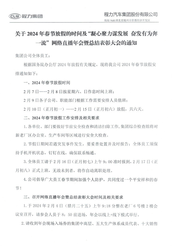 程力汽車集團關于2024年春節(jié)放假的時間及”網(wǎng)絡直播年會暨總結表彰大會的通知