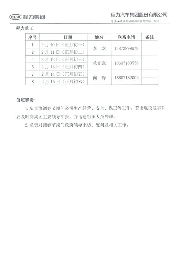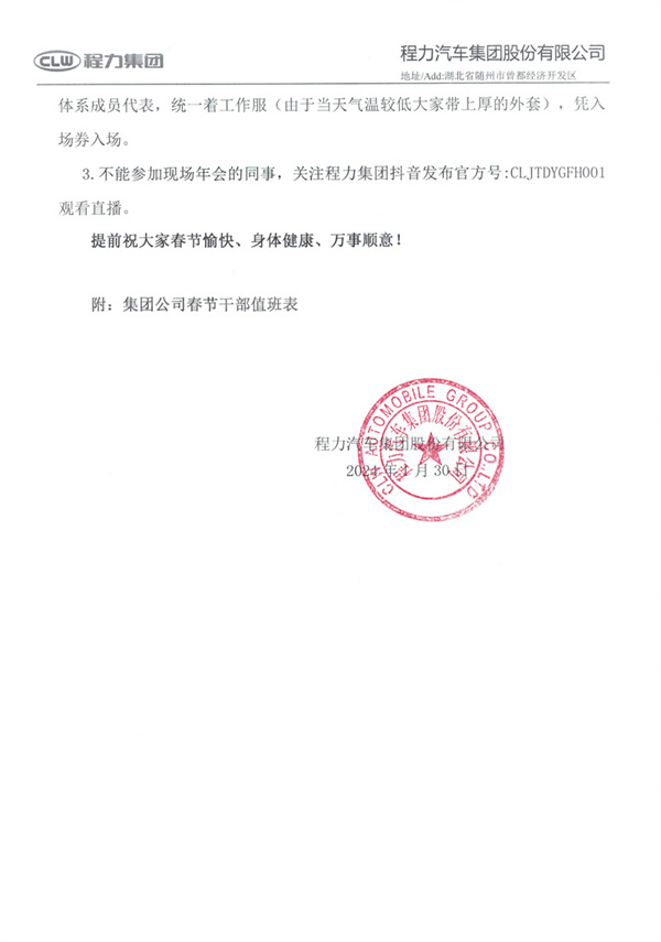 程力汽車集團股份有限公司關于2024年春節(jié)放假的時間及“凝心聚力謀發(fā)展奮發(fā)有為奔 一流”網(wǎng)絡直播年會暨總結表彰大會的通知 程力集團公司全體員工: 根據(jù)國務院辦公廳2024年放假有關規(guī)定,現(xiàn)將程力汽車集團公司2024年春節(jié)放假安排通知如下: 一、2024年春節(jié)放假時間 2月7日--2月8日按星期六、日作息時間上班; 2月9日各子公司、職能部門根據(jù)工作需要安排人員值班; 2月10日(正月初一)一-2月15日(正月初六)放假,共六天。 二、2024年春節(jié)放假工作安排及相關要求 1.各單位、部門要做好節(jié)前安全檢查和清潔掃除工作,集團綜合檢查組將對 新老廠區(qū)辦公室、生產(chǎn)車間等區(qū)域進行安全大檢查。 2.節(jié)假日期間若遇突發(fā)事件發(fā)生,要妥善處置并及時報告;全體員工須保持手機開機狀態(tài),釘釘在線,確保聯(lián)系暢通。 3.全體員工請于2月16日(正月初七)上午9:00準時報到,2月17日(正月初八)正式上班,無故未到者,將作自動離職處理。 4.公司倡導廣大員工春節(jié)期間加強個人防護,共同度過一個平安祥和的春節(jié)! 三、召開網(wǎng)絡直播年會暨總結表彰大會時間及相關要求 1.于2024年2月4日(臘月二十五)上午9:18分整在老廠6號樓2樓會 議室召開,請參會人員于8:50前進場,年會以線上+線下模式舉行。 2.請收到年會現(xiàn)場入場券的集團中高層、五大生產(chǎn)體系成員代表、十大銷售體系成員代表,統(tǒng)一著工作服(由于當天氣溫較低大家?guī)虾竦耐馓?,憑入 場券入場。 3.不能參加現(xiàn)場年會的同事,關注程力集團抖音發(fā)布官方號:CLJTDYGFH001 觀看直播。 提前祝大家春節(jié)愉快、身體健康、萬事順意!附圖: ![]() ![]() ![]() ![]() |