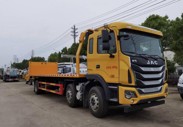 江淮K5小三軸,錫柴290馬力,法士特8檔變速箱 11.00輪胎,280大梁,空調,ABS,行駛記錄儀,電動玻璃升降,電動翻轉,氣囊座椅。 12噸上裝,12噸后托臂,重心低,受力平均,平板尺寸9.6米,平板寬2.55米,10噸液壓卷揚。 湖北程力國六江淮K5小三軸平板清障車(平板長度9.6米)程力牌CL5250TQZH6ZQ型清障車圖片價格: