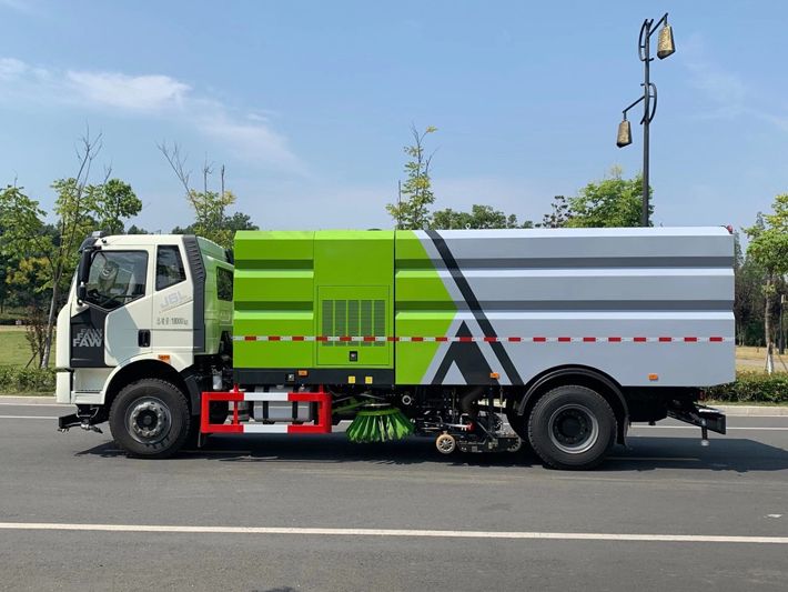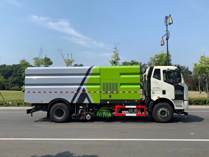 帶2個中置掃盤;中置超寬吸嘴;雙層吸塵筒; 康明斯170馬力副發(fā)動機(jī);臺灣液壓閥;大力馬達(dá);德國高壓水泵 (前沖/側(cè)噴/中噴/后噴霧)/側(cè)沖洗水槍/垃圾箱自潔裝置); 萬向高壓路沿清洗;威龍低壓泵(前沖),氣動球閥控制; 4mm不銹鋼垃圾箱;不銹鋼水箱;德國控制器;尾部箭頭燈; 機(jī)油、垃圾箱、水箱均帶防溢或低位報警裝置;倒車及洗掃狀態(tài)室內(nèi)監(jiān)視器; 多種語音提示;倒車自動保護(hù)、防傾倒垃圾翻車保護(hù)、檢修安全保護(hù); 20m高壓沖洗卷盤;刷臂轉(zhuǎn)動機(jī)構(gòu)使用德國進(jìn)口高新耐磨工程隔套,免打黃油; 冷彎無縫液壓油管;運(yùn)動控制器一鍵電腦控制。洗掃寬度3.5m;吸入粒度p110mm。 湖北程力國六解放洗掃車多方位圖片: