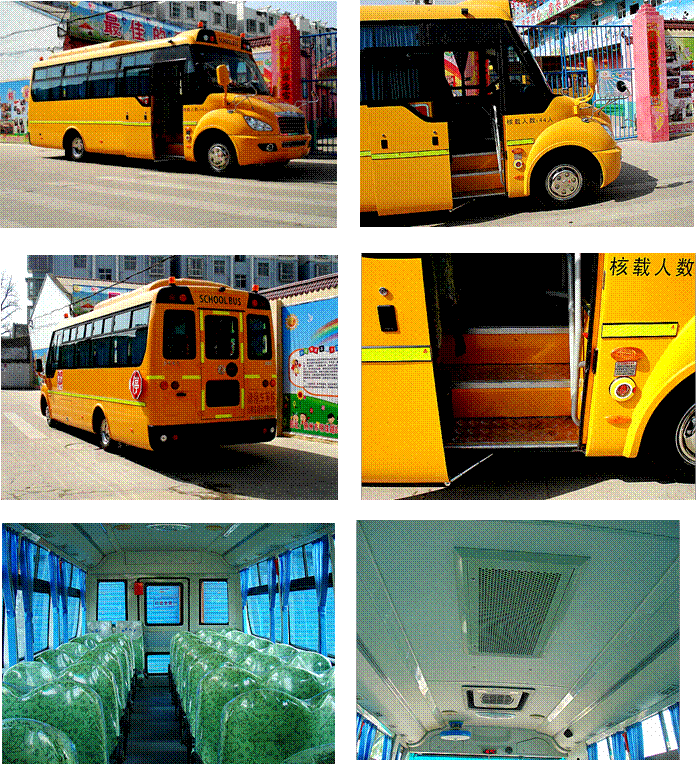 身: 空調內飾、氣動折疊門、車外應急開關,左側安全門,下粘接上推拉側窗,手動倒車鏡,不銹鋼下視鏡、內視鏡,安全衛士監控系統(硬盤錄像機+5探頭+倒車監視)前組合燈具,后圓燈,4盞校車標示燈,GPS行車記錄儀(含MP3收音機)限速裝置,電瓶倉門,800天窗,45座(2+3)幼兒專用座椅(全車安全帶)/43座小學生座椅(配安全帶),整車普通漆、平地板(PVC地板革)無后行李倉,電、氣喇叭、電風扇,電子鐘,小遮陽簾,滅火器2個、隨車工具,上車扶手,校車護欄,醫療急救箱、電動停車警示牌。